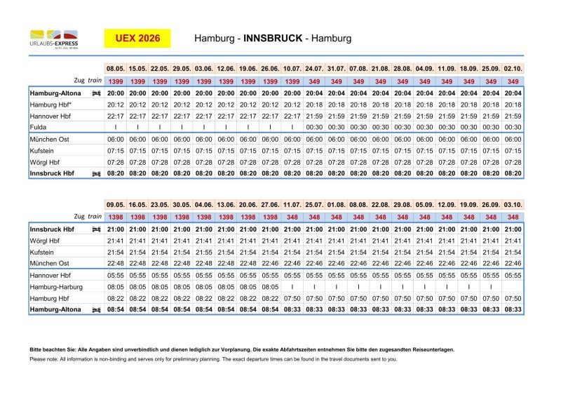Kompletter Sommer-Fahrplan und Abfahrtstage des Urlaubs-Express als PDF