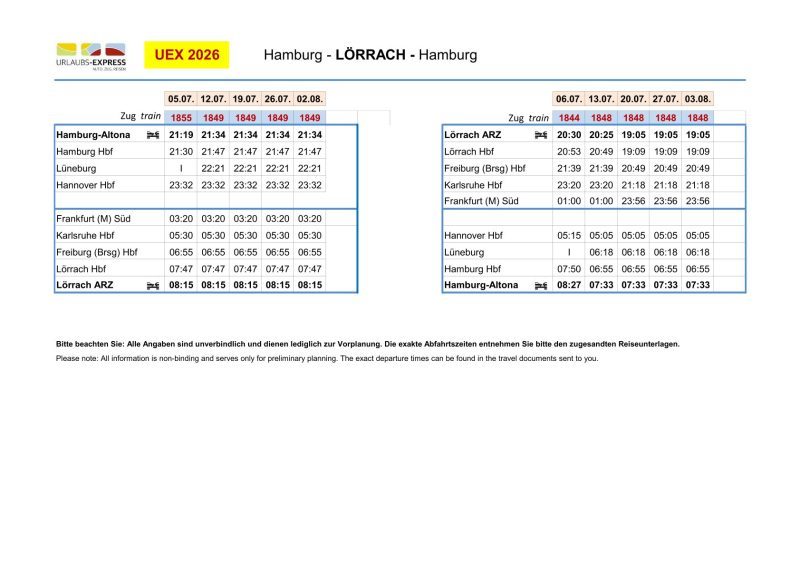 - von Hamburg nach Lörrach (Urlaubs-Express von Mitte Mai bis Ende Oktober 2026; BTE ganzjährig)