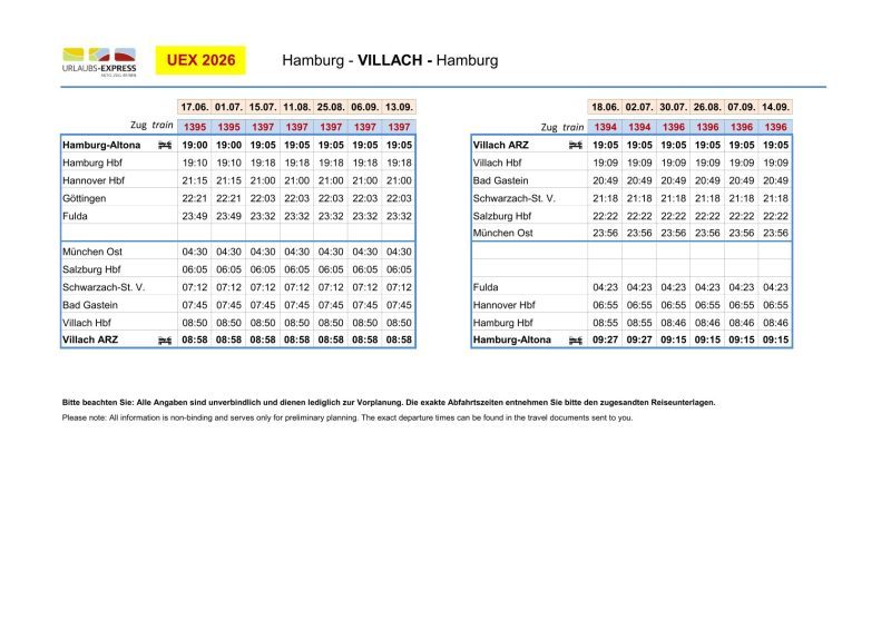 - von Hamburg nach Villach (Urlaubs-Express von Mitte Juni bis Mitte September 2026)